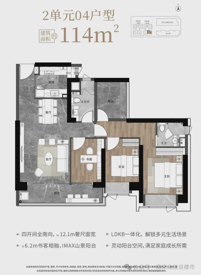 竖厅设计,主卧旁边“阳台”处、书房实际可以做一个房间,主卧套房设计,客餐厅一体,阳台连通客厅和书房,宽敞实用。
